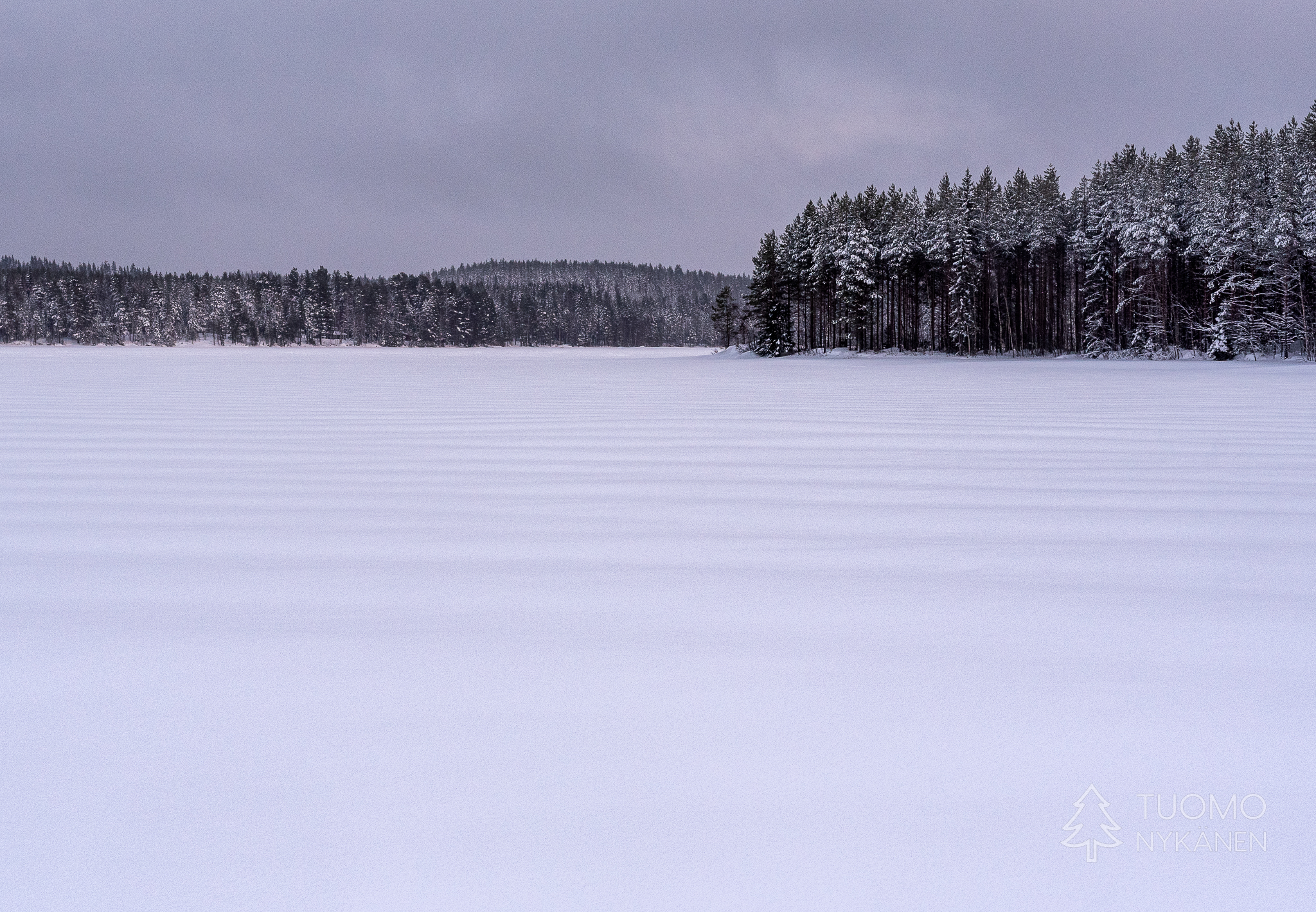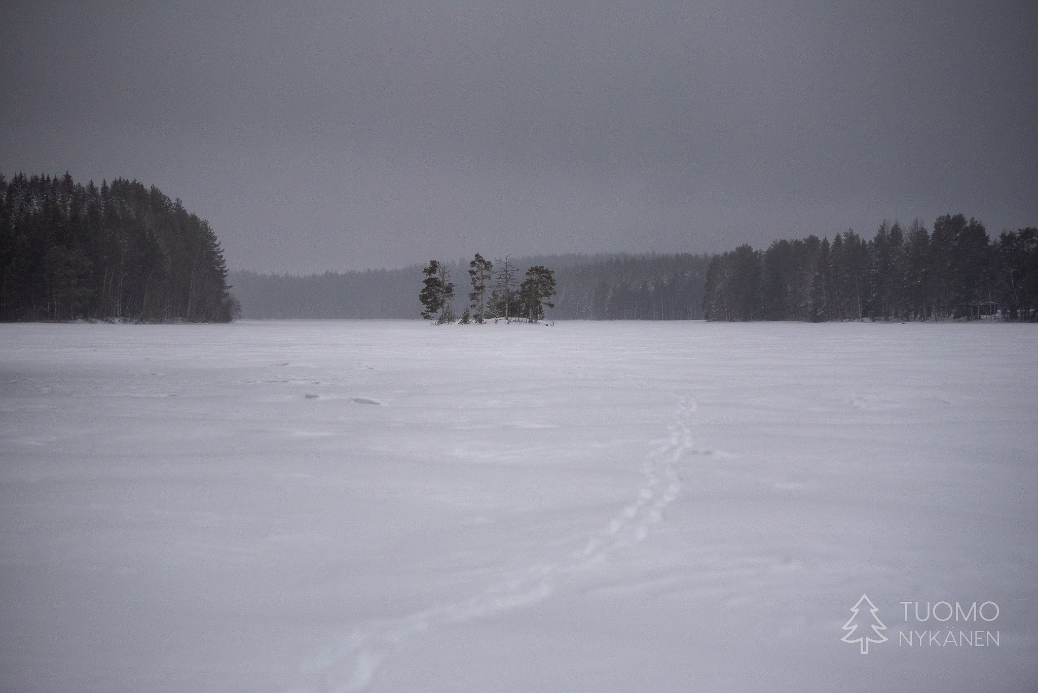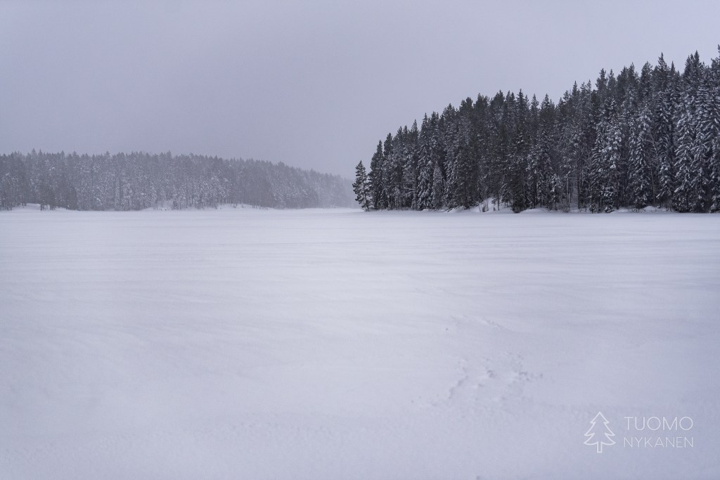 Järvi itsessään on kovin kesy, se ei vello eikä ääntele kun tuuli vihmoo sen yllä. Veet lepäävät sikeästi kun hiihdän niiden yllä kohti tämän valkean lakeuden kylkeen työntyvää niemenkärkeä – Tervaniemeä.