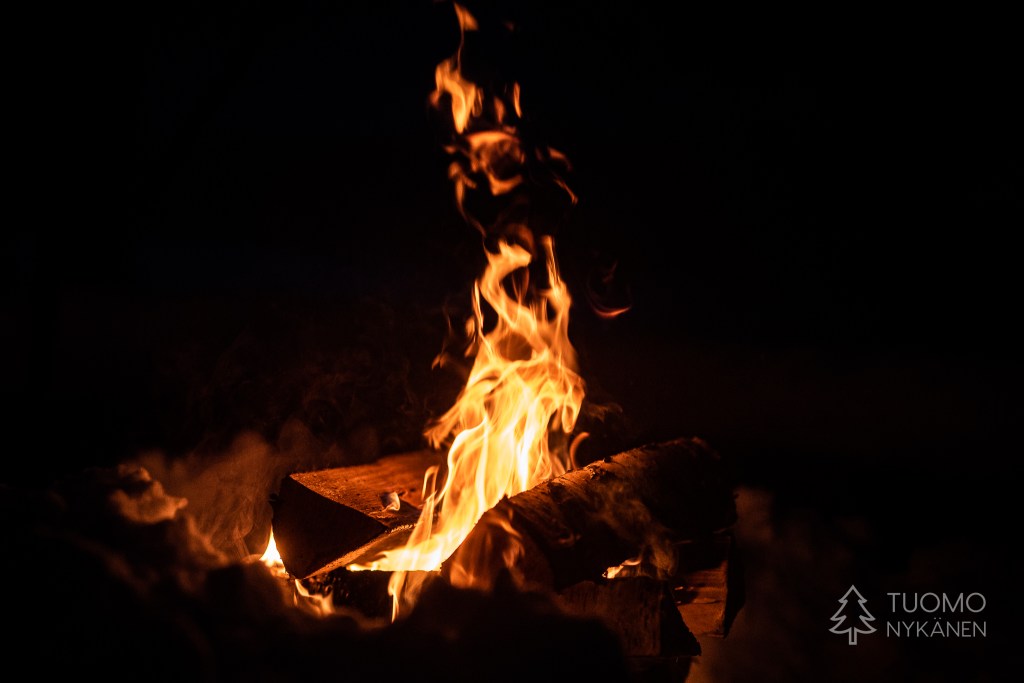 Kaivan ahkiosta puut ja kasaan ne laavumuodostelmaan tuulta vastaan, yritän olla huolellinen ja rakentaa suojatun sekä helposti syttyvän pesän, en millään jaksaisi taistella tuulta vastaan. Raapaisen myrskytikun, työnnän sen paikoilleen ja tuli alkaa ahnaasti nielemään halkojen kylkiä – ihanaa.
