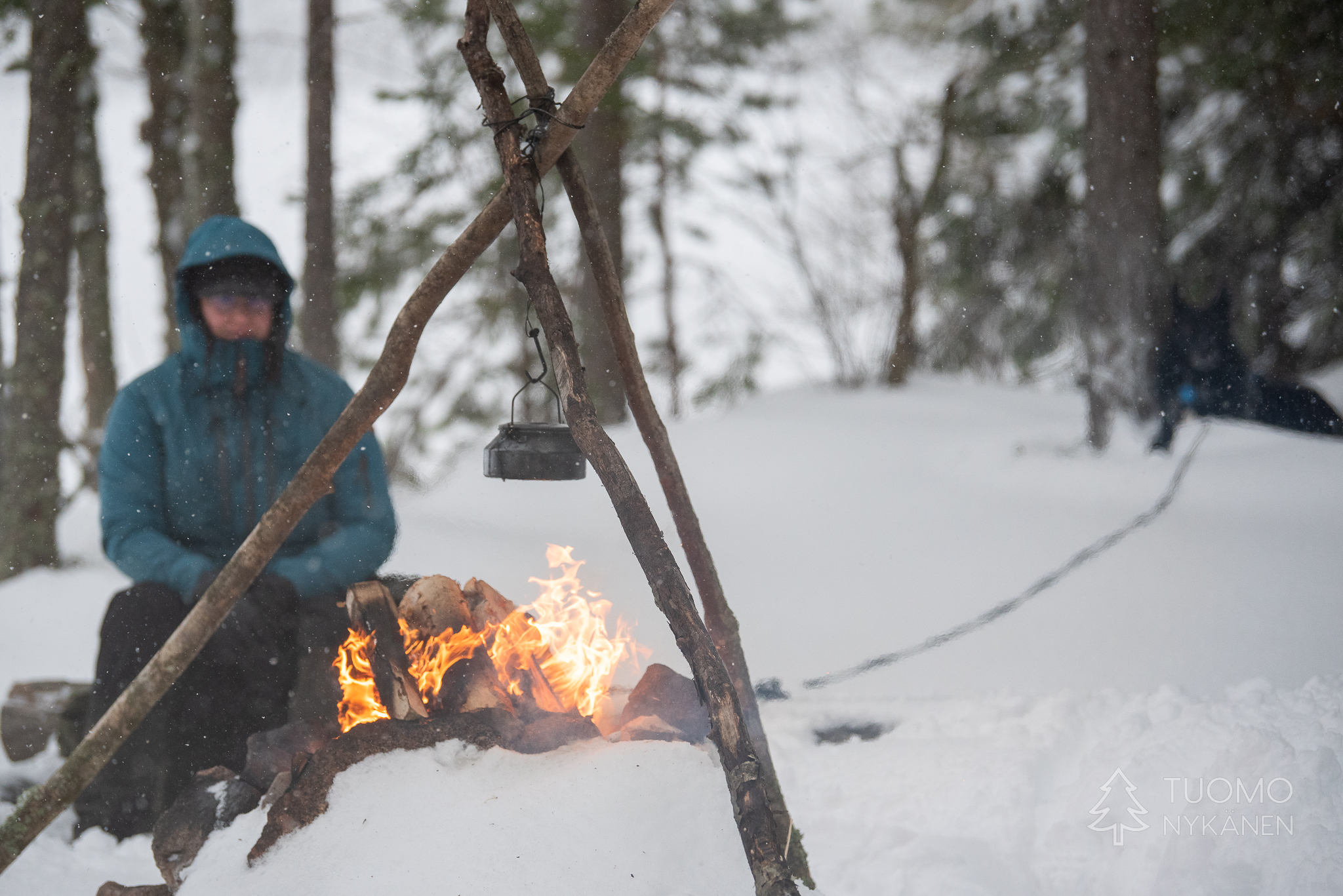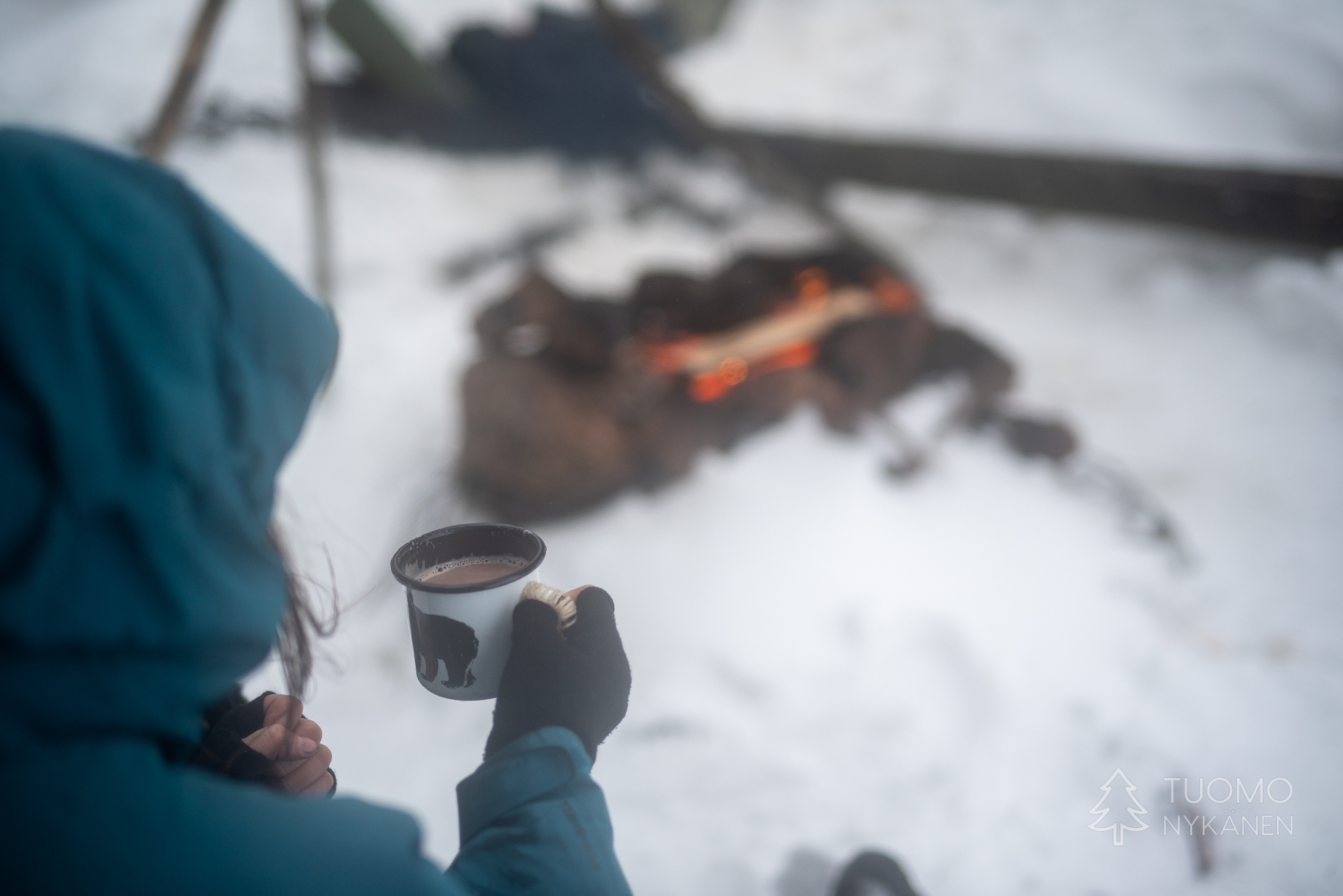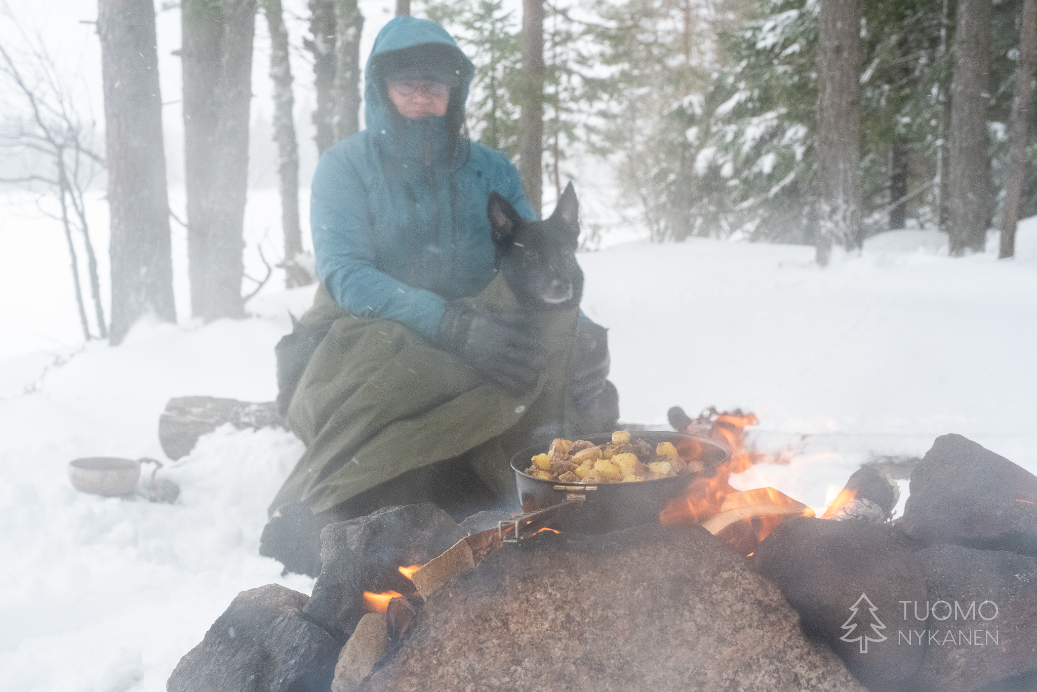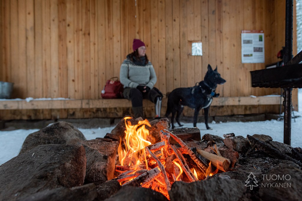 Paluumatka tunnelmallisen sinisen hetken läpi alkaa jo ramaisemaan ja perillä odottava lämpö viimeistään sinetöi tarpeen istahtaa takkatulen lämpöön kuivattelemaan vaatteita. Tästä seuraava askare onkin siirtyminen pihalle istumaan iltaa pimeyteen piirtyvän nuotiokehän sisälle.