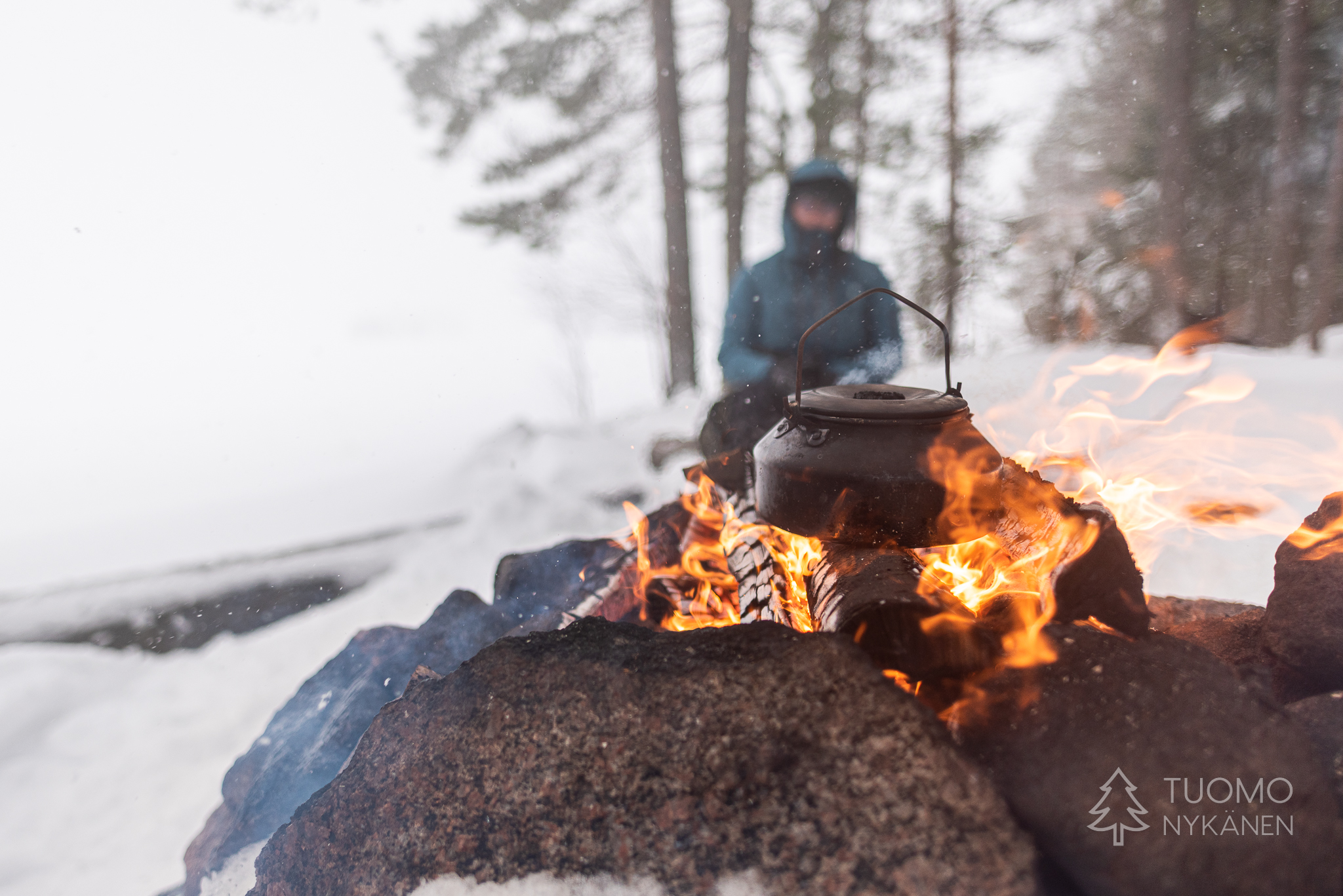 Emme pidä kiirettä, vaan nostelemme pannua yhä uudestaan lämpenemään ja katselemme huppujen sisästä kuinka kaukana siintävät saaret ja rannat pyyhkiytyvät näkyvistä ilmestyäkseen taas pian hetkeksi näkyviin. Tämä on säätä parhaimmillaan, myräkkä elää takin ulkopuolella kylmänä ja kovana mutta ulkoisen kuoren sisällä olen itse suojassa ja lämmin. Käännän kasvoja hieman suojatakseni niitä jäisiltä hiutaleilta ja nostan kuksan uudelleen huulilleni – kahvia kuluu.