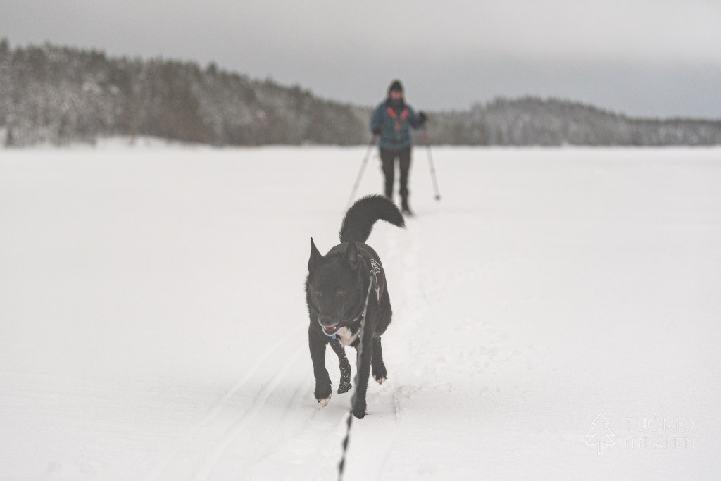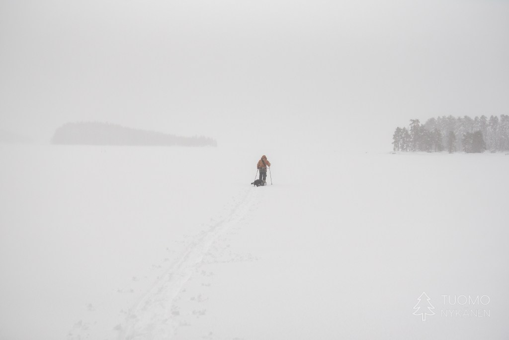 Irrottelen hyhmää onnistuneesti suksien pohjasta, lunta on niin paljon että jäälle nousevaan veteen on paljon matkaa eivätkä sukset pääse kastumaan tukkoon. Järven selälle päästyämme puiden tarjoama tuulen suoja loppuu ja alamme tuntemaan puhalluksen täyden voiman. Samaan aikaan lumi alkaa olemaan jäistä ja kovaa joten matkanteko alkaa nyt todenteolla helpottumaan.