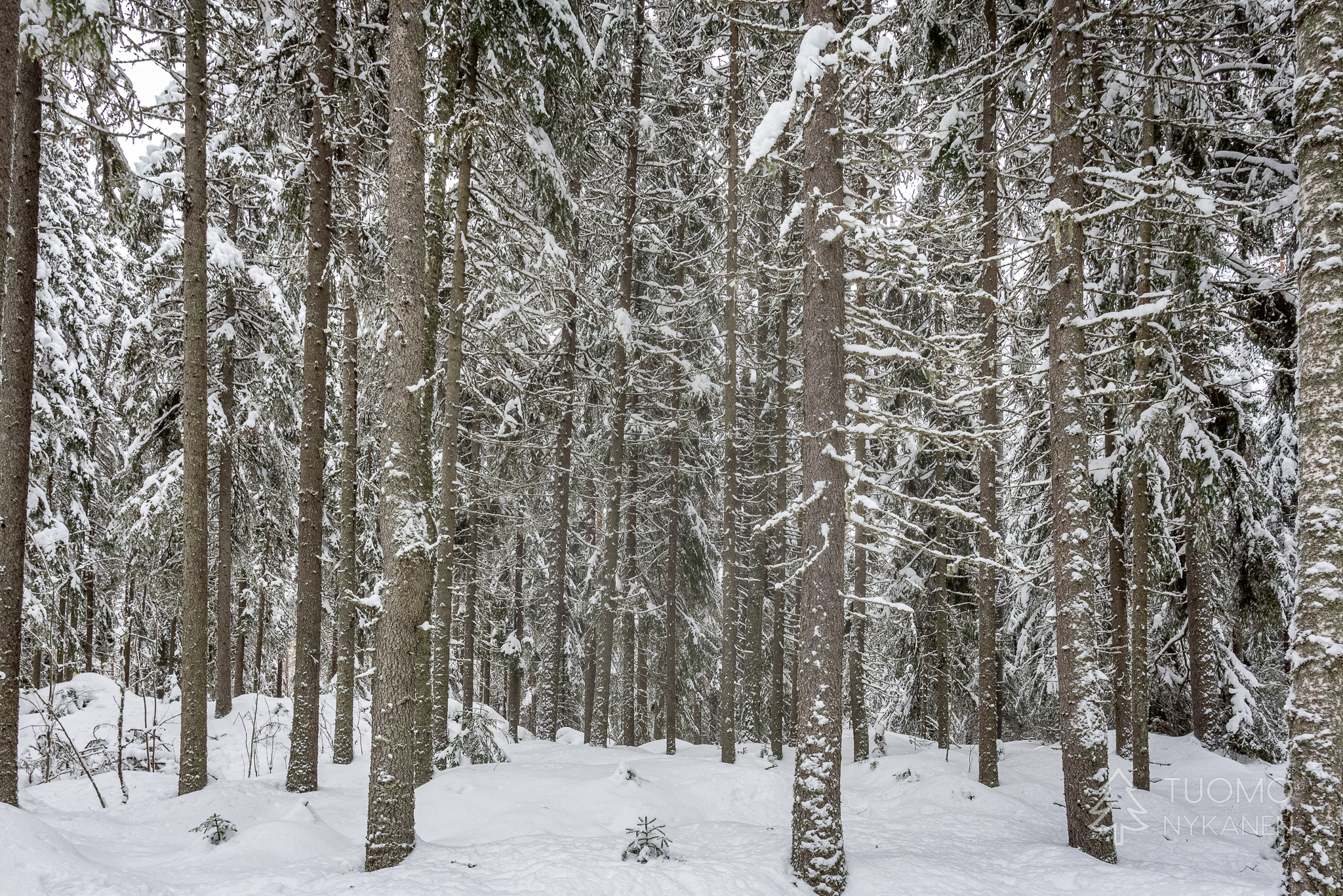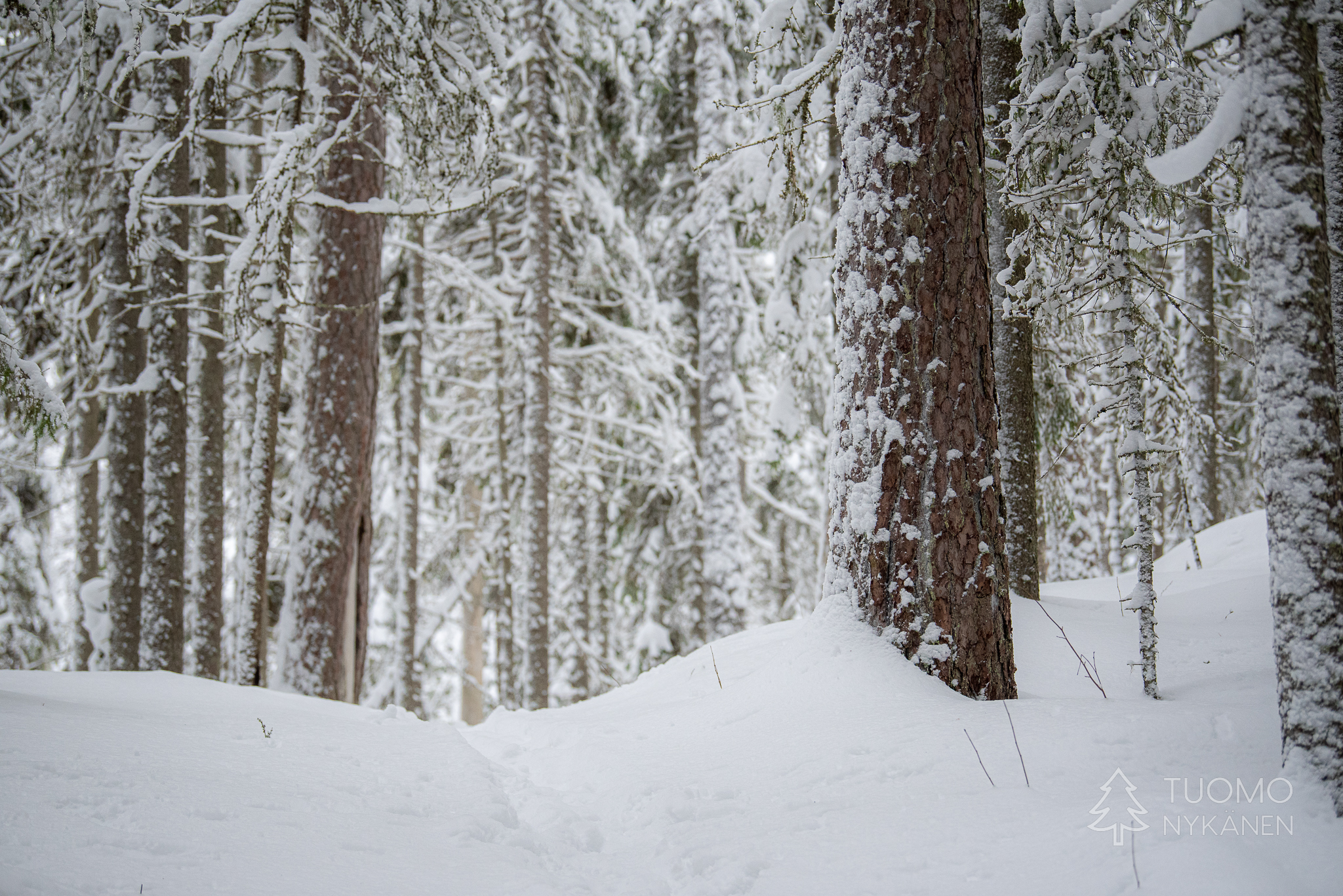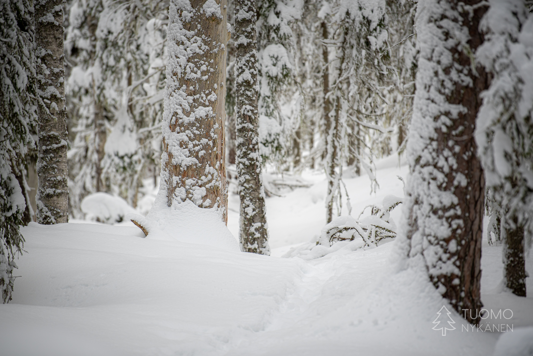 Vaikka aamulla nukuttaisikin makeasti emme jää kuluttamaan aikaa paikoillaan oloon vaan aiomme suunnata Multiharjun aarnimetsän ja Kintulammin retkeilyalueen kautta kotia kohti. Valoisan ajan lyhyys ja korkeiden hankien hidastava vaikutus takaa ettei aikaa kannata liikaa tuhlailla. Käyn matkan varrella tutkimassa ympäristöä sekä suksilla että vain jalan, välillä laiskasti ilman suksia tehty pohraaminen tahtoo muuttua hylkeen lailla mahallaan etenemiseksi. Vaikka olen painava ja lumi on kevyttä se käyttää tottuneesti judo-otteita ruhoani vastaan jottei minulla ole mitään mahdollisuutta määrätä tämän leikin tahtia. Isompaa viedään kuin heittopussia niin että tekisi mieli syöksyä turvaan kovalle maalle mutta ympärillä on vain lunta, lunta ja lunta.