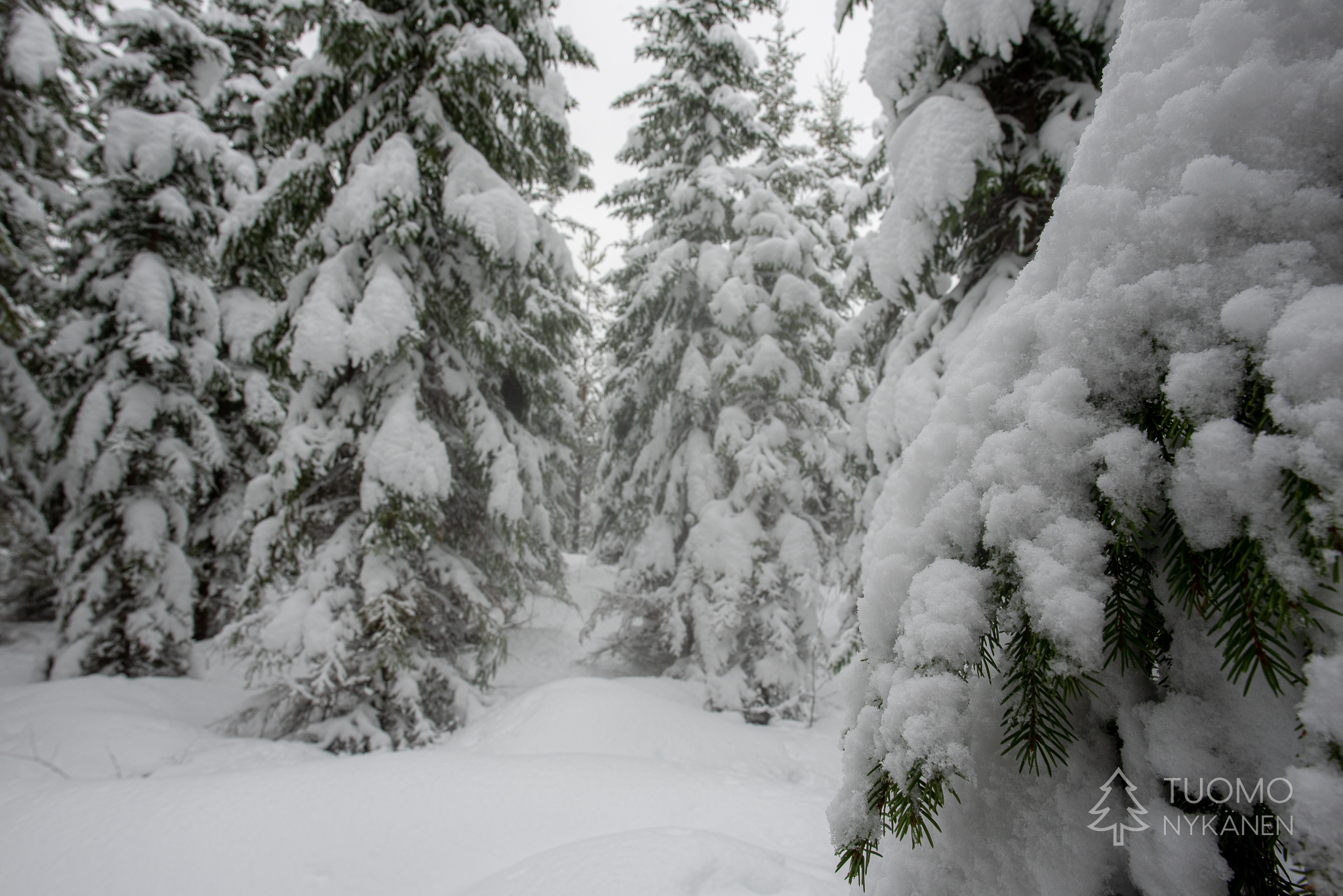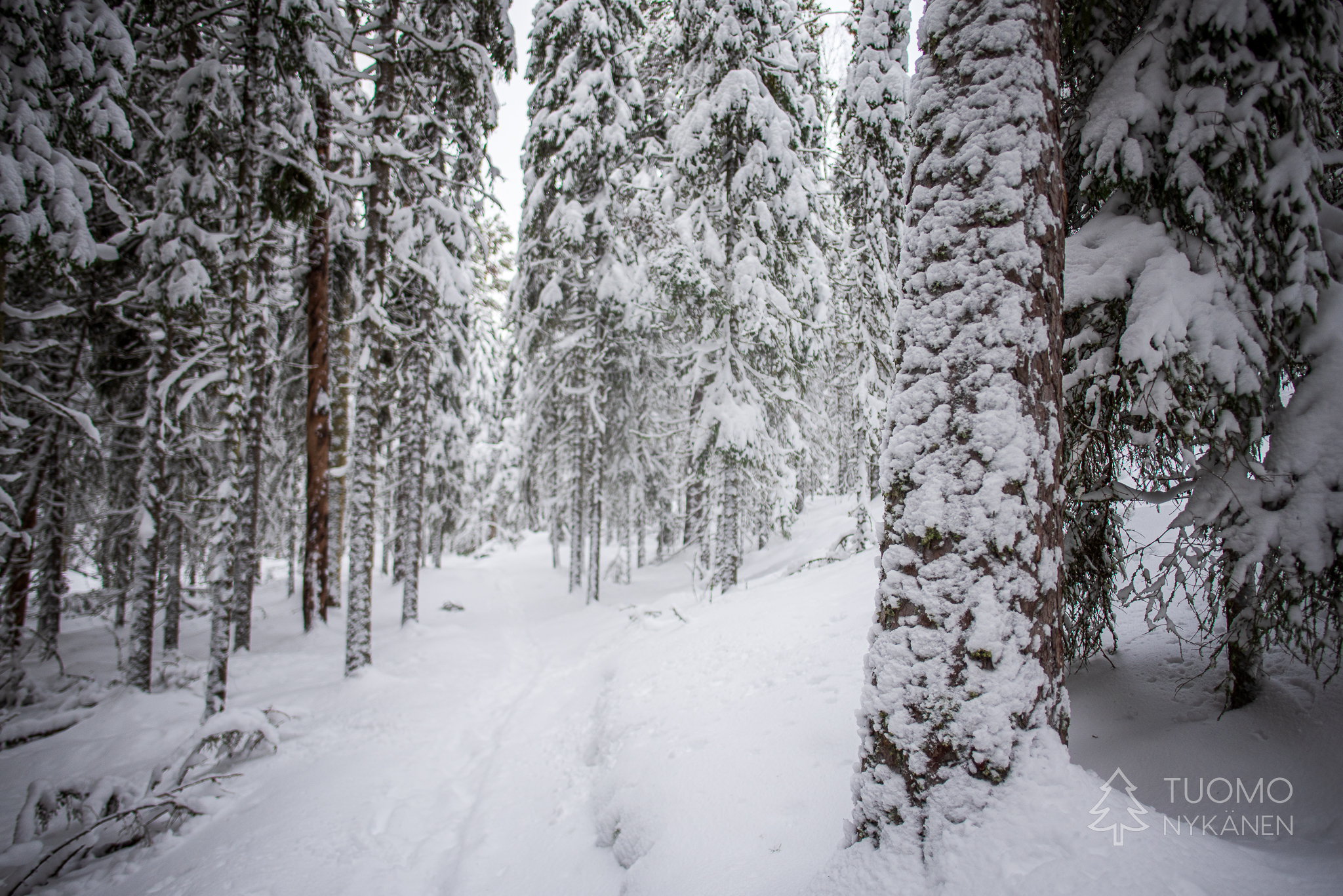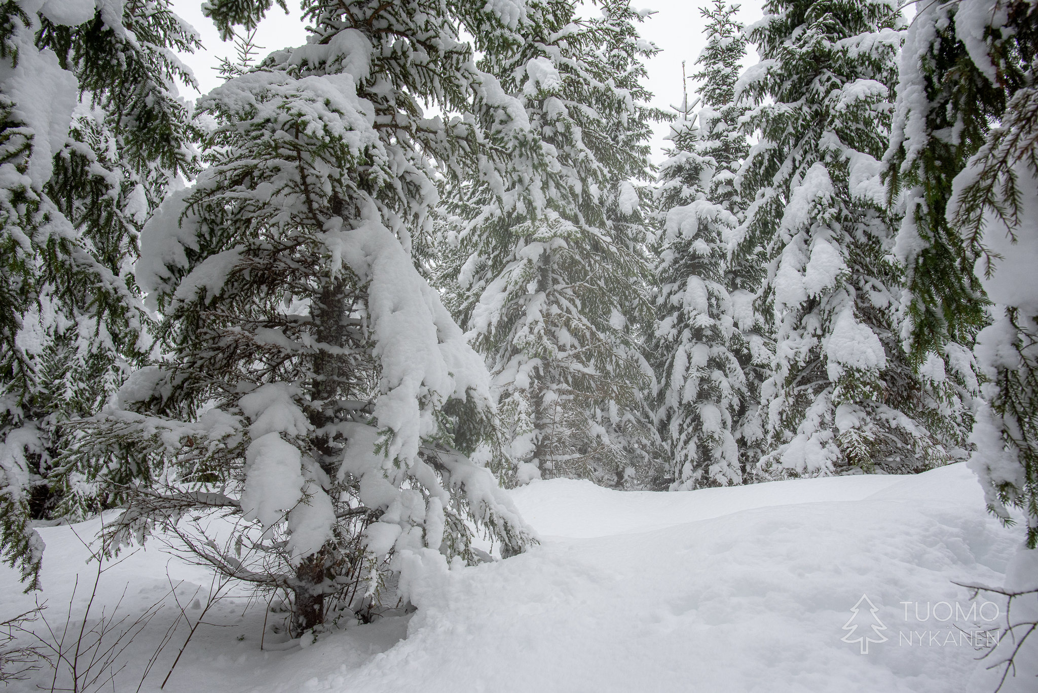 Todella lumista, puut ovat aivan kuorrutettuja ja oksat notkuvat niiden päällä lepäävien nietosten painosta. Tie tuntuu kuitenkin, ainakin vielä, mukavan luotettavalta vaikkakin hieman liukkaalta lumen alla. Se on kuitenkin kaukana tasaisesta, lumi on kinostanut dyynejä jotka paikoin tuntuvat syviltä. Etenemme varovasti sillä tien reunoja on todella vaikea hahmottaa, pitäisi olla keltaiset linssit aurinkolaseissa tällaisille keleille jotta tien kontrastit olisi edes jotenkin nähtävissä. Pistämme merkille paikkoja missä auton mahdollisesti pääsee kääntämään jos tie muuttuu huonommaksi, toki jos jokin näistä suhteellisen jyrkistä mäistä onkin liukas ei sitä pakitellen nousta. Korkean mäen päältä yhytämme edellämme tietä kulkeneen auton joka on jätetty tien sivuun ja jatkettu matkaa jalan. Sinänsä epäilyttävää edessä olevan tien kunnon suhteen, varsinkin kun kyseinen ajoneuvo on huomattavasti omaamme maastokykyisempi.